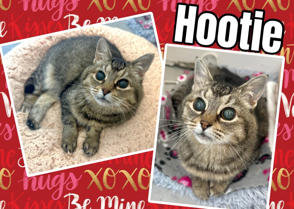 Hootie is a petite kitty with a slightly stubby tail, fluffy cheek tufts, and big, dilated pupils, which give her an ‘owl-like’ appearance. Her adjustment from life outdoors to the pampered indoor lifestyle with a selection of cat beds to choose from, a heated cat mat, and zero concerns about predators could not have been smoother. She may love to be the only cat of the household but has had an easy time sharing her foster home with other cats. (She just grumbles or hisses to let them know that she likes her space.)