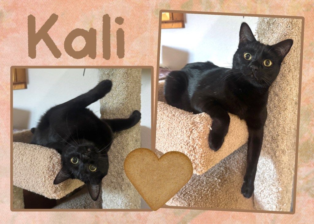 Kali is a petite, 1.5-year-old, super-sleek, black kitty with giant, sweet eyes. She is fun-loving and playful but her favorite activity is cuddling. She nuzzles into you and rubs up against your side to give you love. She gives off emphatic chirps when she wants attention, is a little clumsy, and loves to play with pipe cleaners and snuggle on your lap. She can be a little shy at first, but once she feels safe, she loves as much of your affection and attention as she can get. She’s good with other cats (and probably dogs too) and is just full of love- an absolute joy to have in your home.