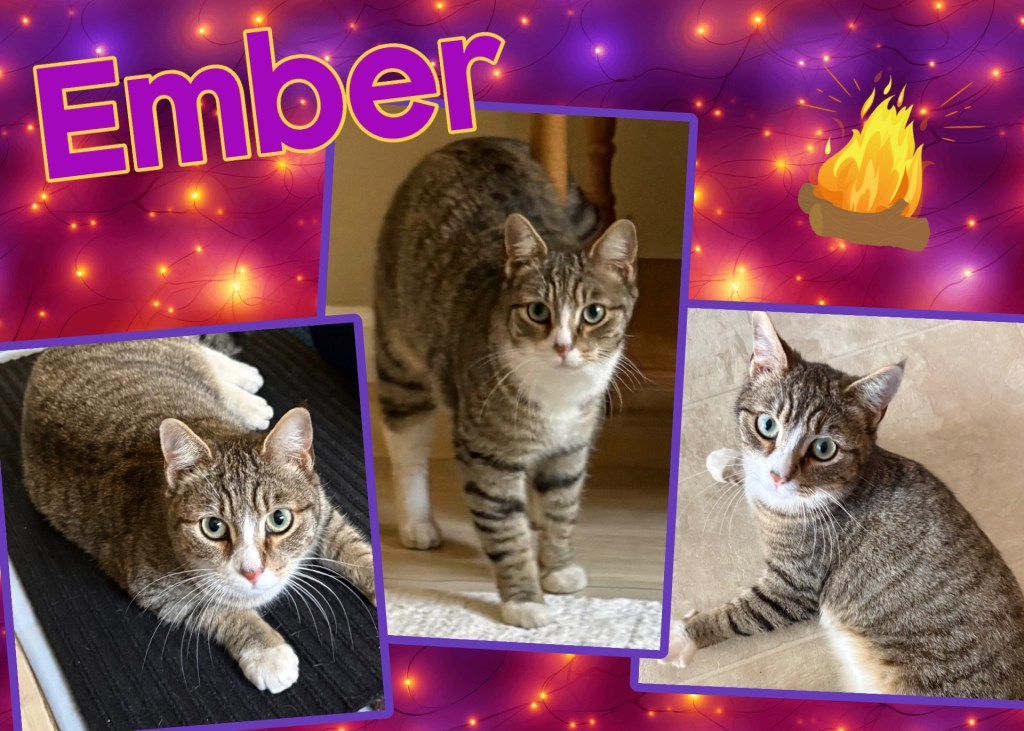 Ember is about 1 yo old and is very quiet, undemanding, relaxed, and very affectionate. She loves to play with wand toys, the 3 in 1 interactive toy, etc. She doesn’t mind being picked up, having her belly petted, she enjoys being brushed. She loves looking out the window. She has gorgeous green eyes that give you that ‘trusting, I love you’ look!