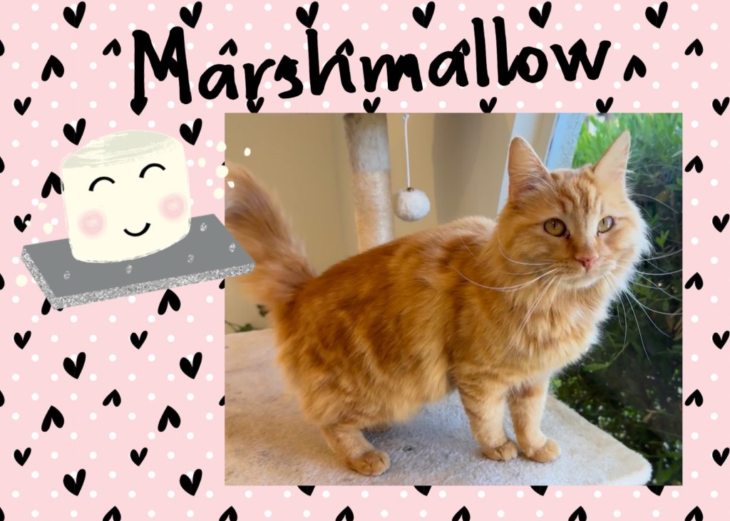Marshmallow is a 1-year-old fluffy orange sweetheart who lives up to her name—soft, warm, and impossible not to love. She’s as friendly as they come, always ready for pets, happy to be held, and quick to rub against your legs to ask for more attention. With her affectionate nature and easygoing personality, she gets along great with other cats and would make a loving addition to just about any home.
