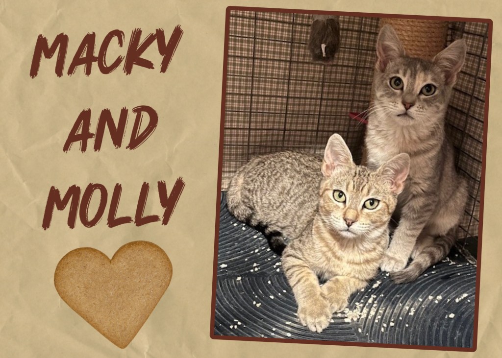 These siblings were born in mid June 2025. Macky is a brown tabby with deep stunning stripes and jungle print spots. Molly is a muted tortie. She has a streak of light fur on her head like Bonnie Raitt.