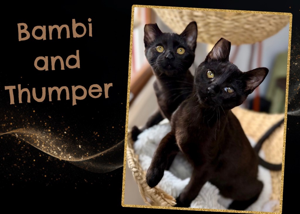 Bambi is a sleek, shiny black beauty with bright, curious eyes and a confident little strut. She loves gently head-butting your face and is a purr machine. She is bold, silly, and full of personality. One minute she is chasing a toy or sprinting up the stairs, and the next she is occupying your lap for immediate attention. Bambi has a bright, vibrant spirit and bonds deeply with her people.