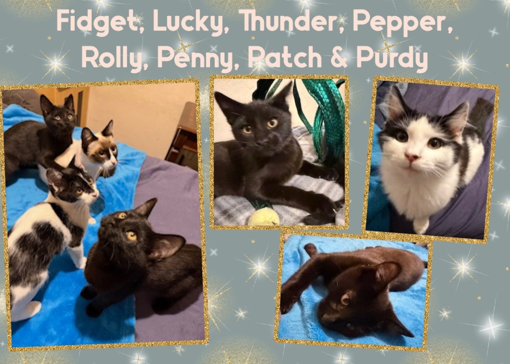 Fidget, Lucky, Thunder & Pepper – all black males Rolly – white & black male Penny – white with black spots female Patch – black & white long-haired male Purdy – white & black long-haired female