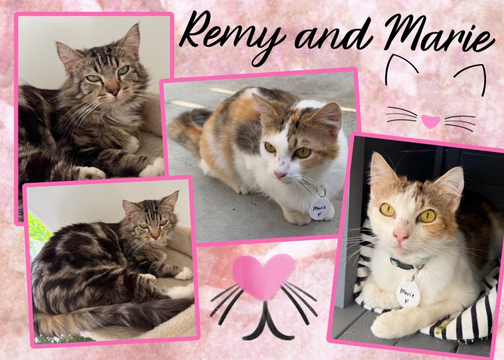 These 1-year-old best friends were brought in together after being left to fend for themselves when their owner left them behind, and they’ve been inseparable ever since. Remy, a long-haired tabby boy, is quiet, easygoing, and incredibly sweet—he loves gentle pets and cozy naps. Marie, a calico/tabby girl, is curious and more outgoing, always caring for Remy with grooming and snuggles. They share a special bond and would love to find a forever home together where they can continue to comfort and love each other.