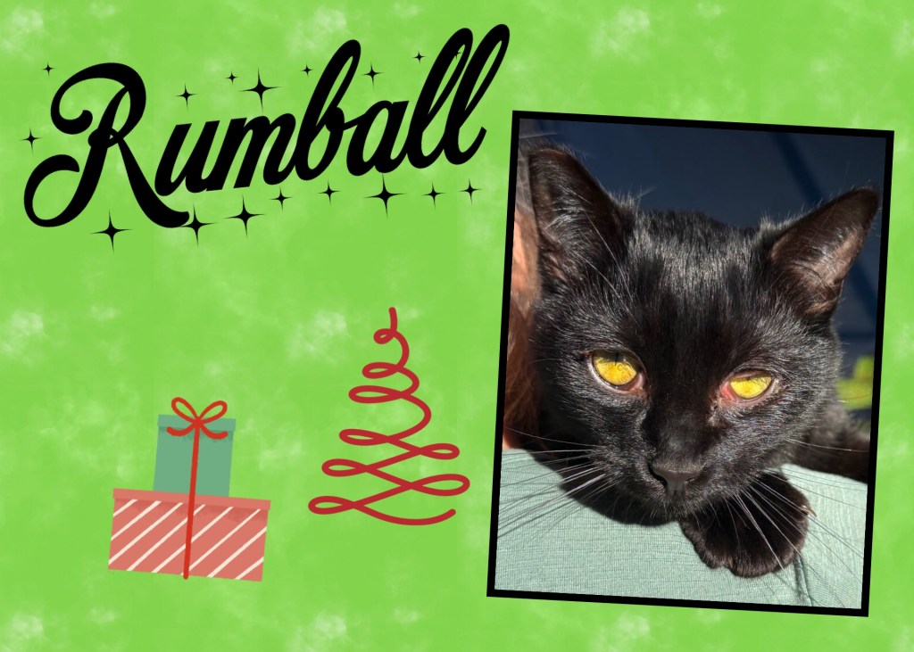 Rumball is a handsome black kitten born in April. Loves to be held like a sleeping baby. Loves to zip through his tunnel toys. Very curious and social once he warms up. Very quiet meow.