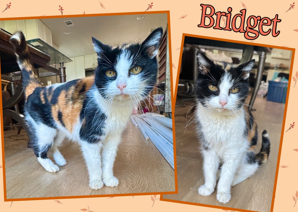 Bridget is a beautiful 14-year-old calico sweetheart. She is an amazing, social and affectionate companion. She loves to be near you, getting pets and kisses; and she will purr for you all day. Bridget also happens to be a catnip junkie: She relishes her daily dose of ‘nip, rolling in it, breathing it in, and then curling up for a nap with a window view. Bridget does well with other cats; she is calm, non-confrontational, and just enjoying her golden years. She’d love a mature household who will return her love and adoration.Special needs: Bridget has hyperthyroidism and requires a single pill twice per day (Cost of medication: $10 per month). Otherwise, she is a very healthy girl.